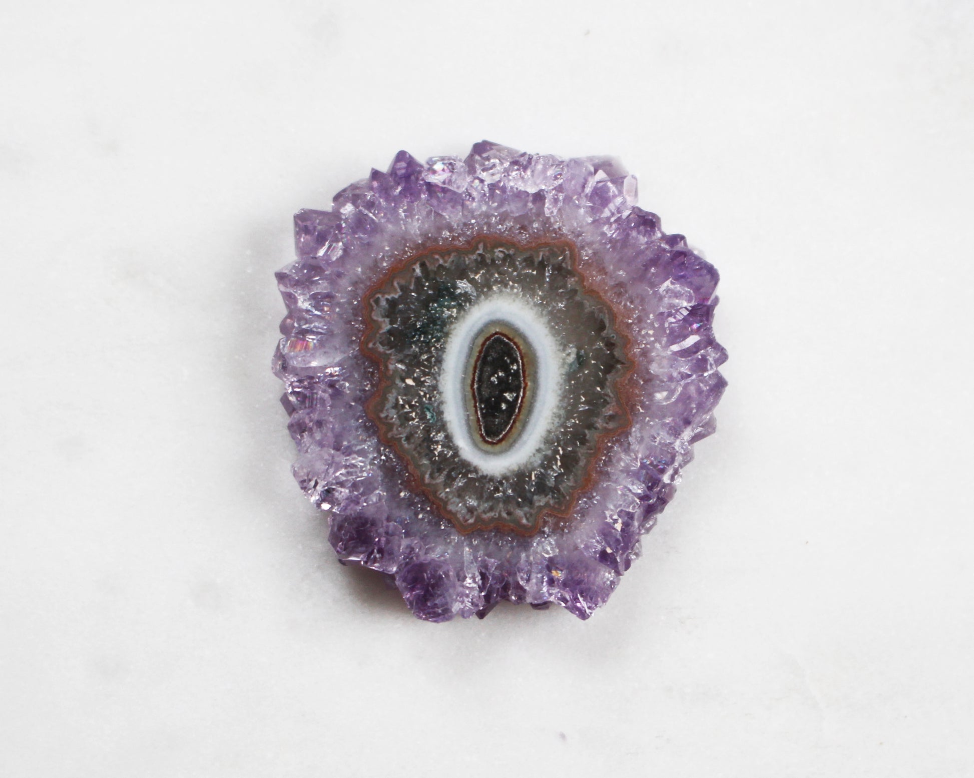This amethyst stalactite crystal slice ranges in color from a mid-tone purple to brown, clear, white and green in the center. It is very similar on both sides as can be seen in the photos. Measures 1 1/4 x 1 3/8 inches in diameter.