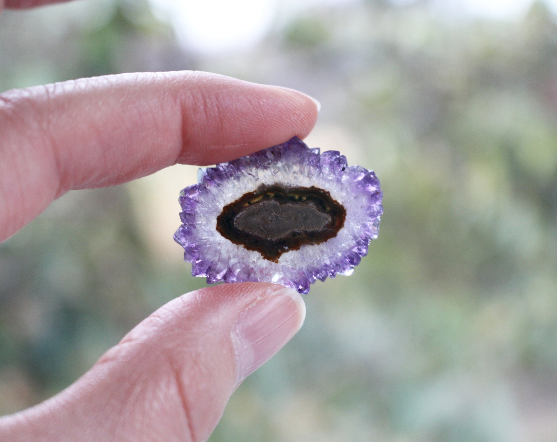 This unique oval shaped amethyst stalactite slice ranges in color from dark purple to lavender to clear with an opaque brown, green and beige center. Coloring is similar on both sides. Measures approximately 1 x 1 1/4 inches in diameter.