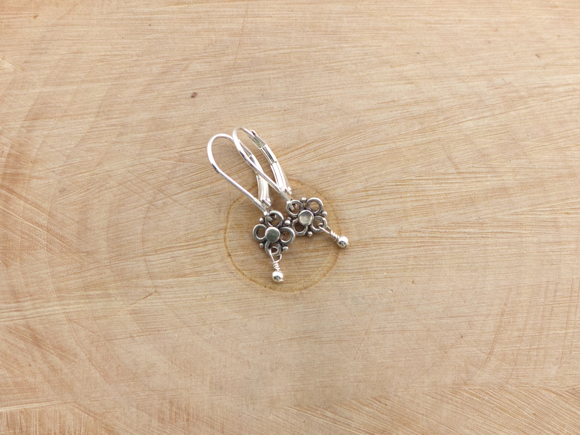 These earrings feature extra small slightly oxidized sterling silver flower drops accented with tiny silver beads and suspended from secure lever back ear wires. Lightweight and perfect for every day. Total length measures 1 inch from the top of the ear wires.