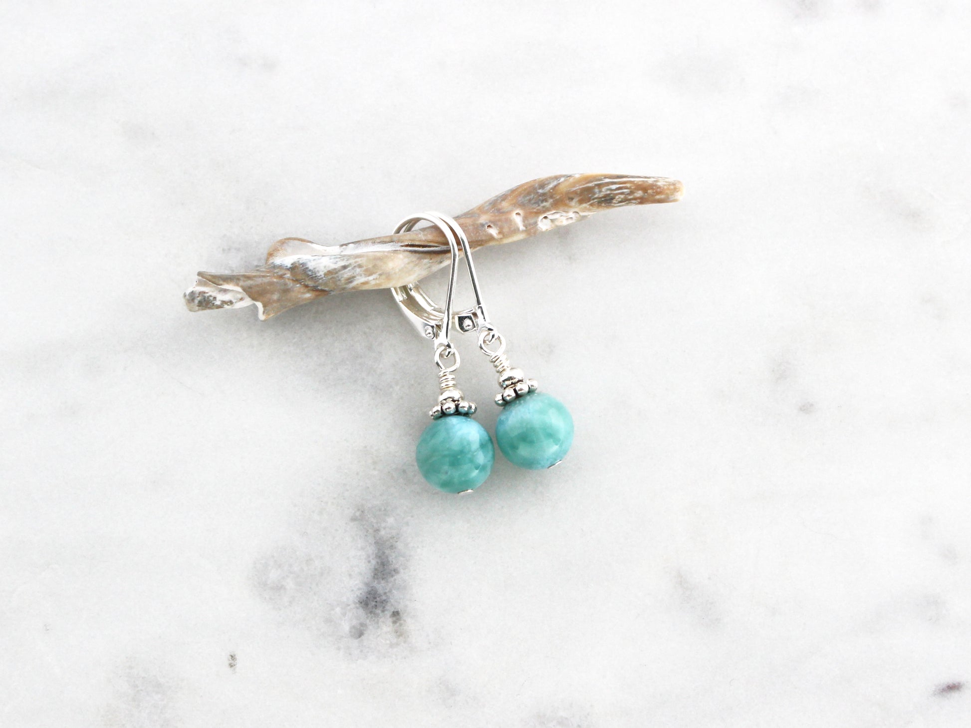 8mm natural Larimar gemstones are paired with oxidized Turkish and sterling beads in these earrings which dangle from secure lever back ear wires. These stones are light blue with subtle hues of blue green mixed in for a beautiful variation of color. Larimar is unique because it originates from only one place in the world, the Dominican Republic, therefore this rare stone is becoming increasingly valuable. Total length from the top of the ear wires measures 1 1/4".