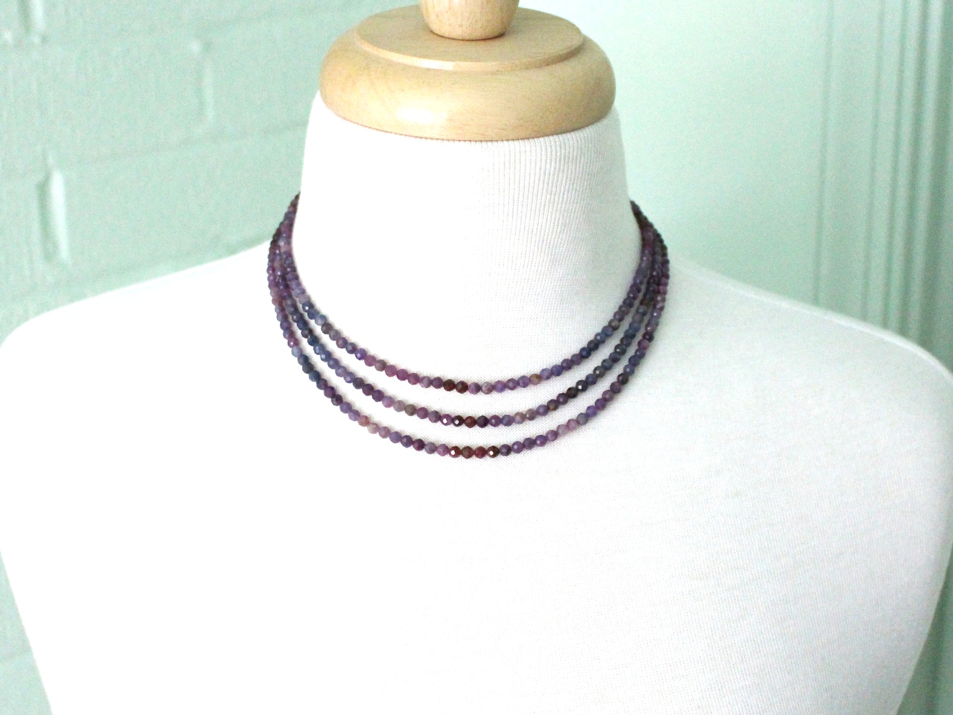 This sparkly necklace features an unusual combination of all natural purple ruby and sapphire beads arranged in a shaded pattern throughout three layered strands. Various hues of pink, purple, mauve and blue shine in this unique design. Finished with a secure sterling silver lobster clasp and extender chain. Can be worn between 16 1/2 inches and 18 1/4 inches in length.