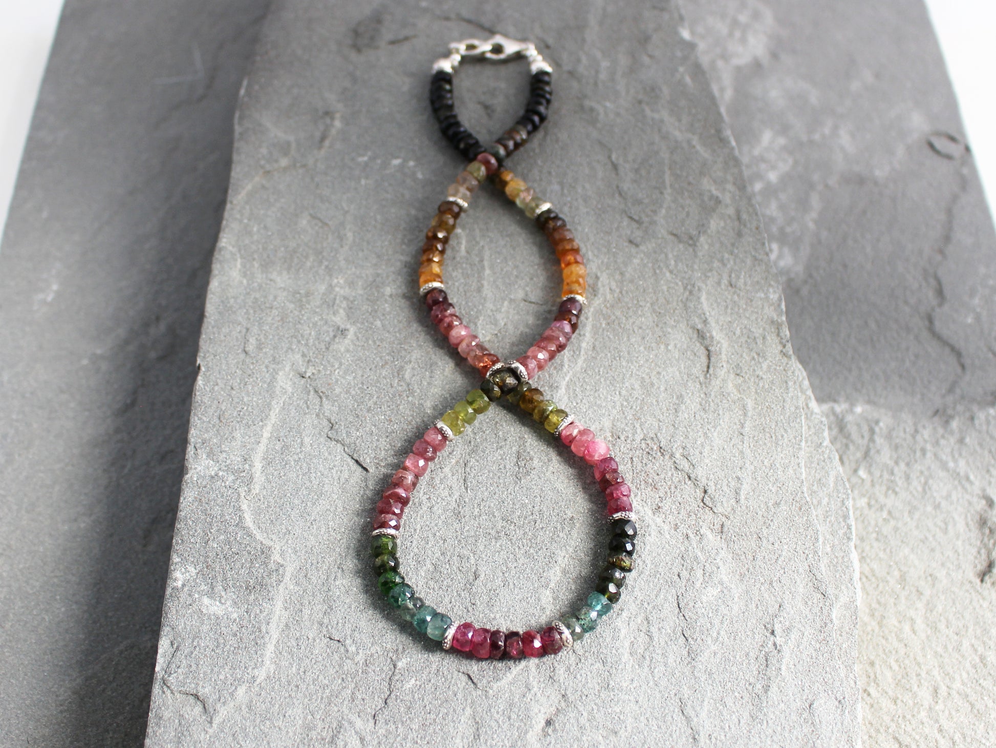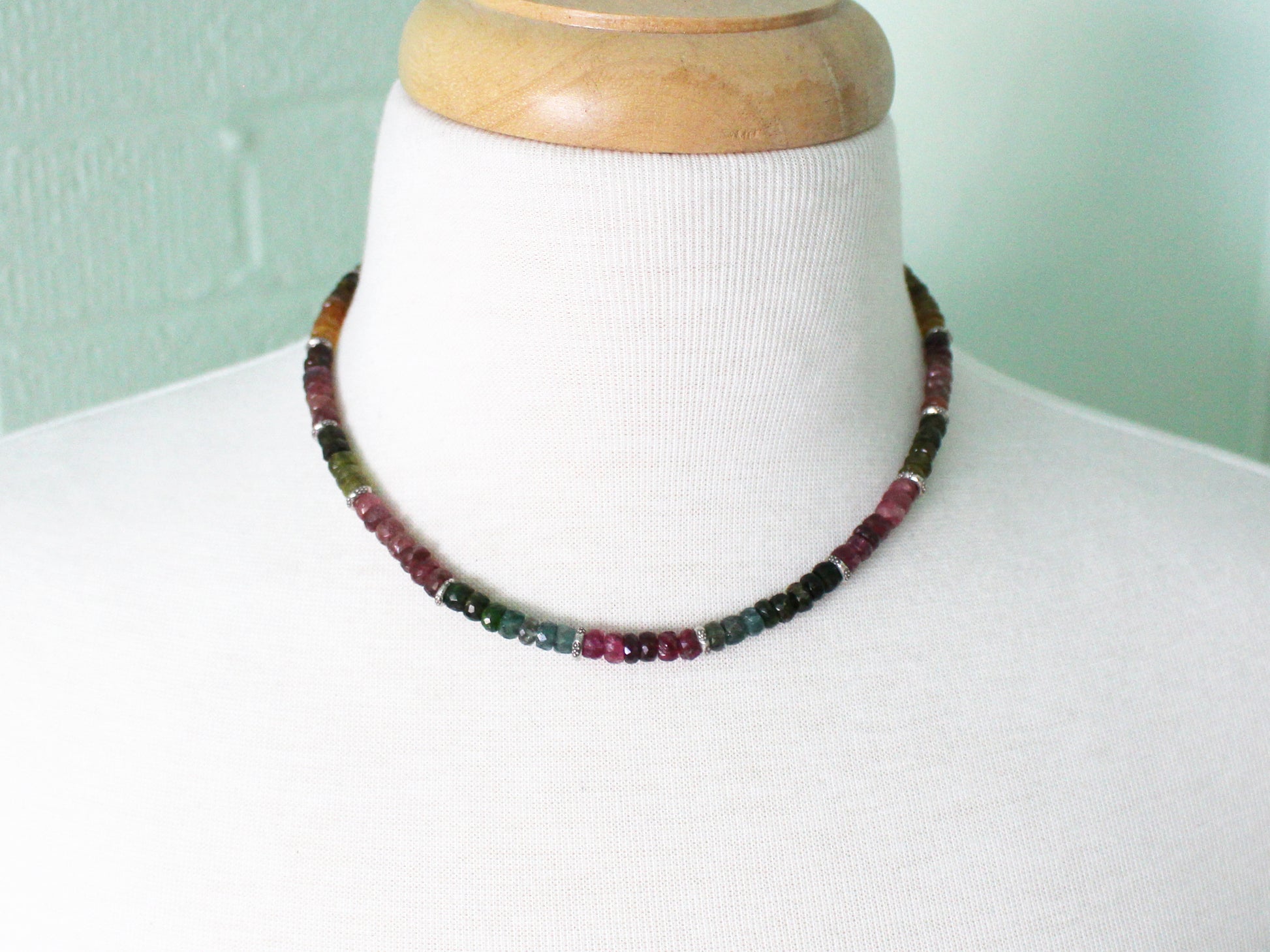 This necklace features a sparkling array of faceted rainbow tourmaline gemstones from pink to blue to orange and brown. These all natural beads are accented with fine silver discs and finished with a sturdy sterling silver lobster clasp. Total length of this necklace measures 17 3/8 inches.