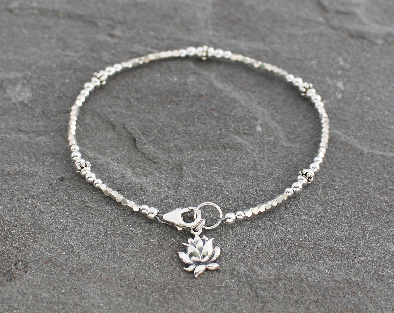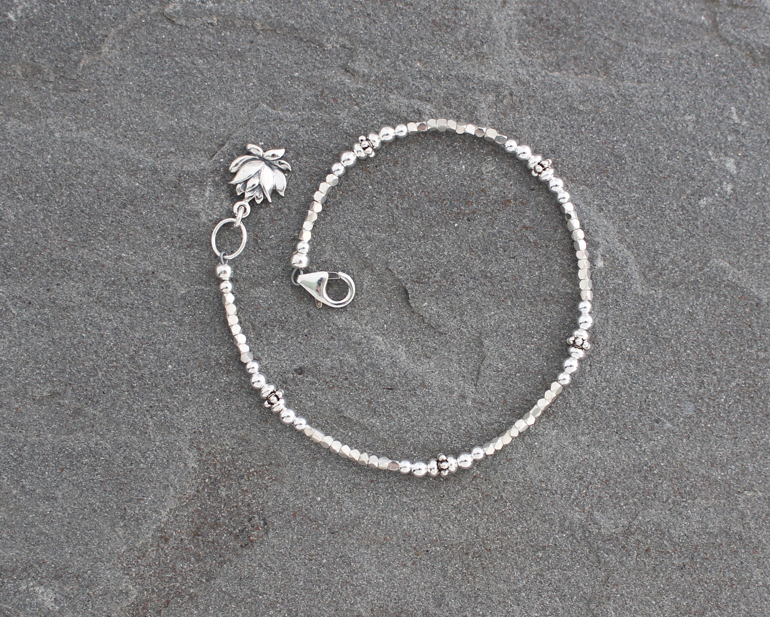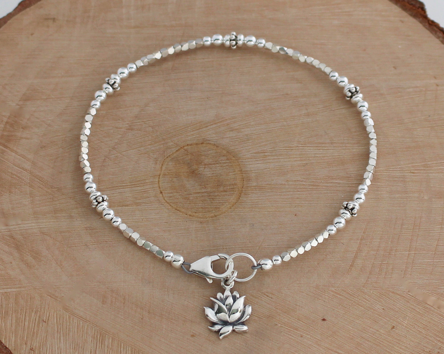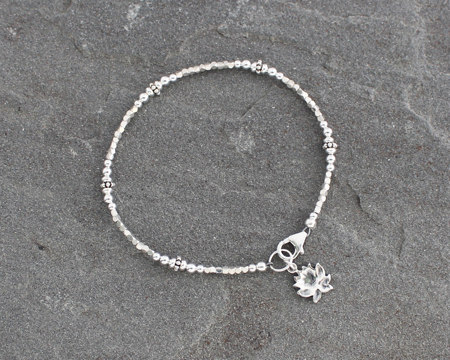 Faceted sterling cubes sparkle in this beaded bracelet with a few oxidized Turkish accents. Finished with a secure lobster clasp and sterling lotus flower charm. Wear it solo or layer it with other bracelets.