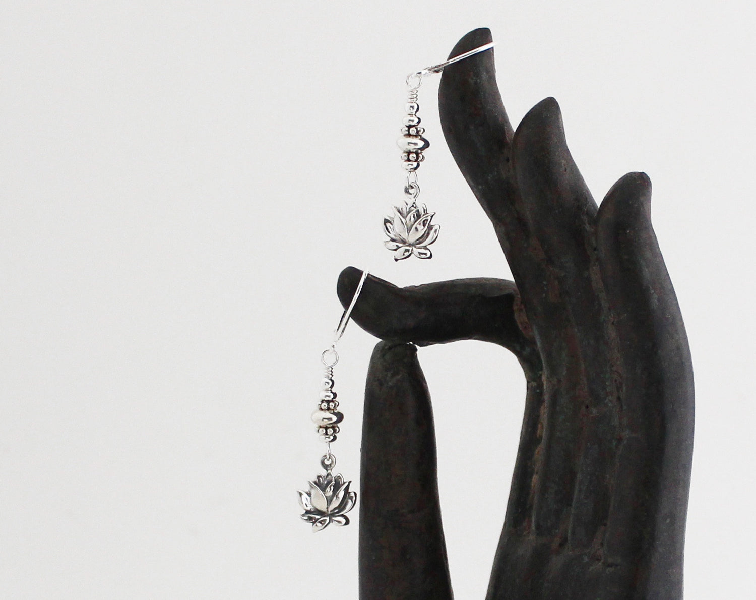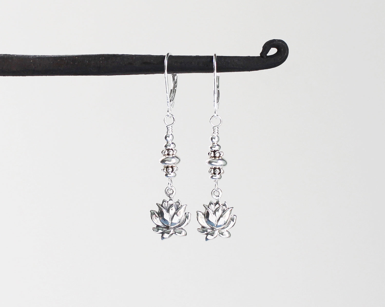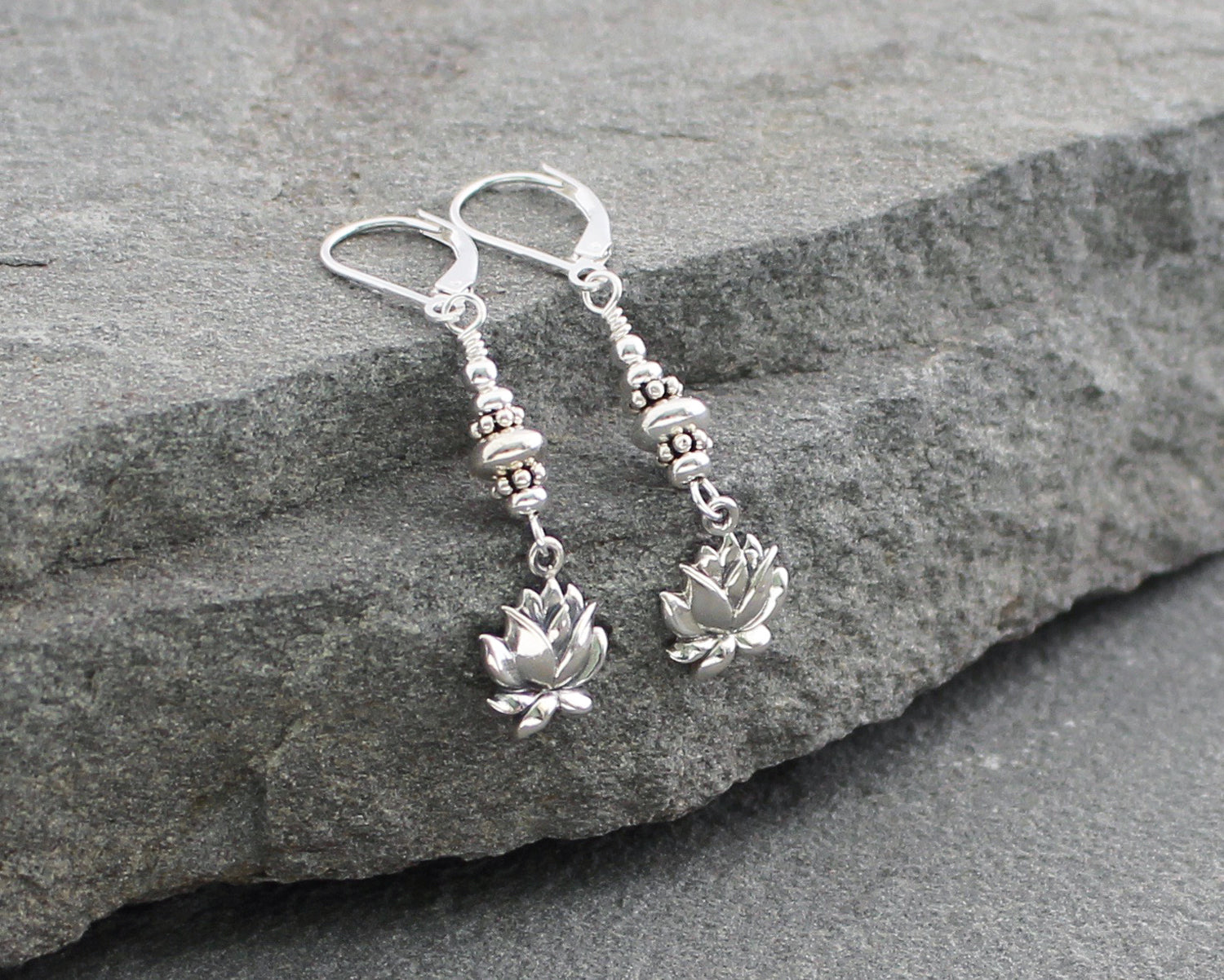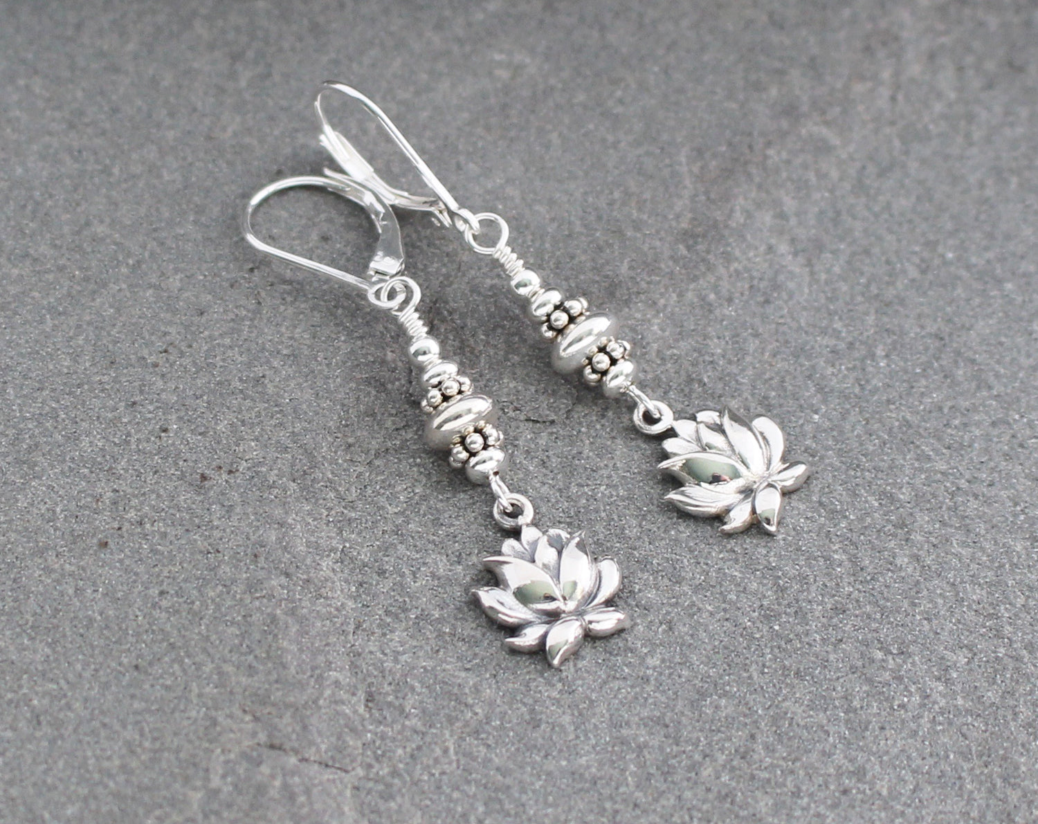 Sterling silver lotus flowers are suspended from a stack of sterling beads and securely wire wrapped to dangle from silver lever back ear wires. Lightweight and lovely. Perfect for everyday wear. Length measures 1 3/4 inches from the top of the ear wires.
