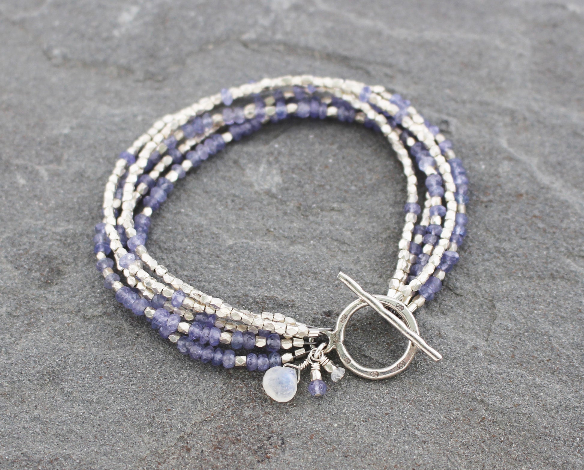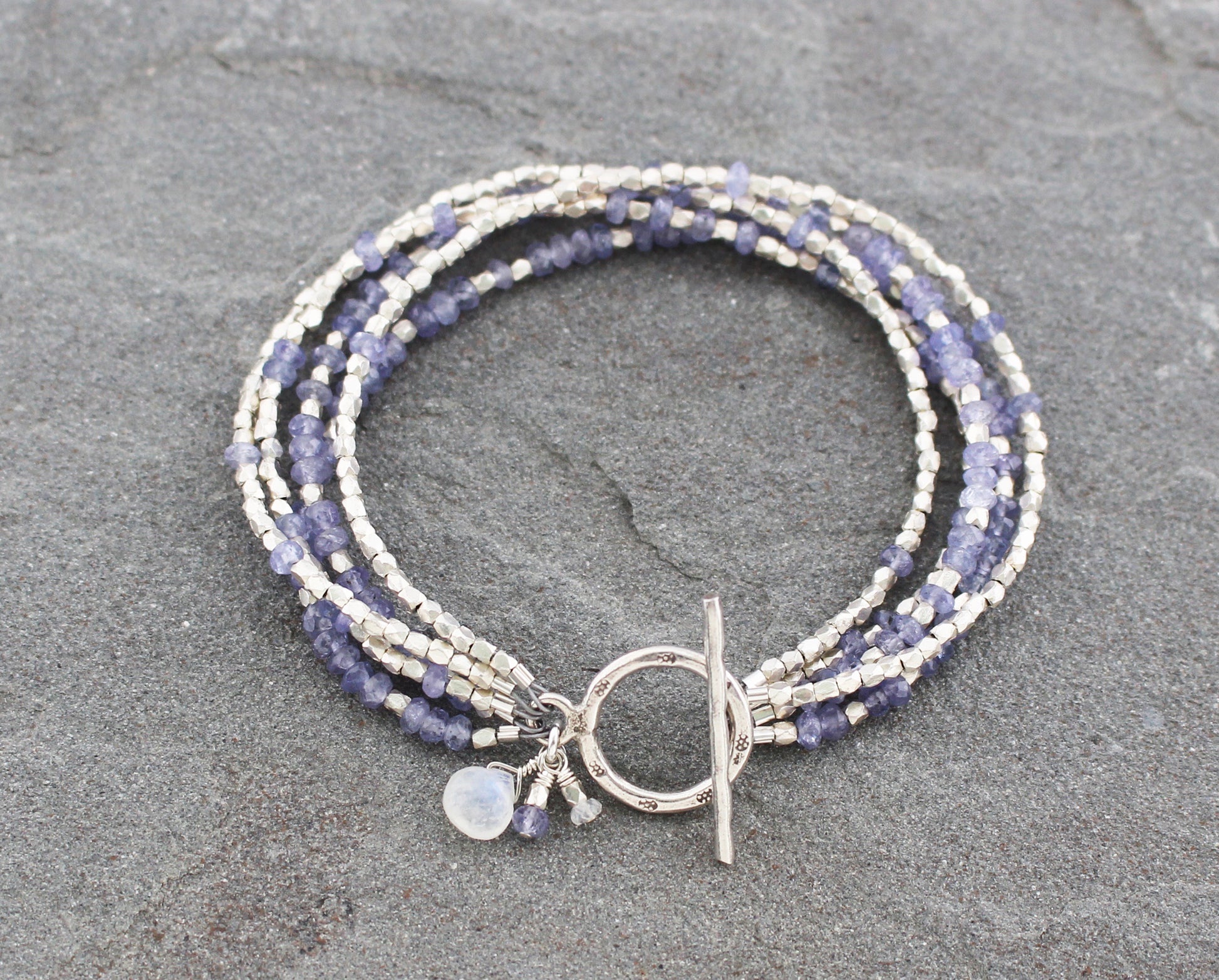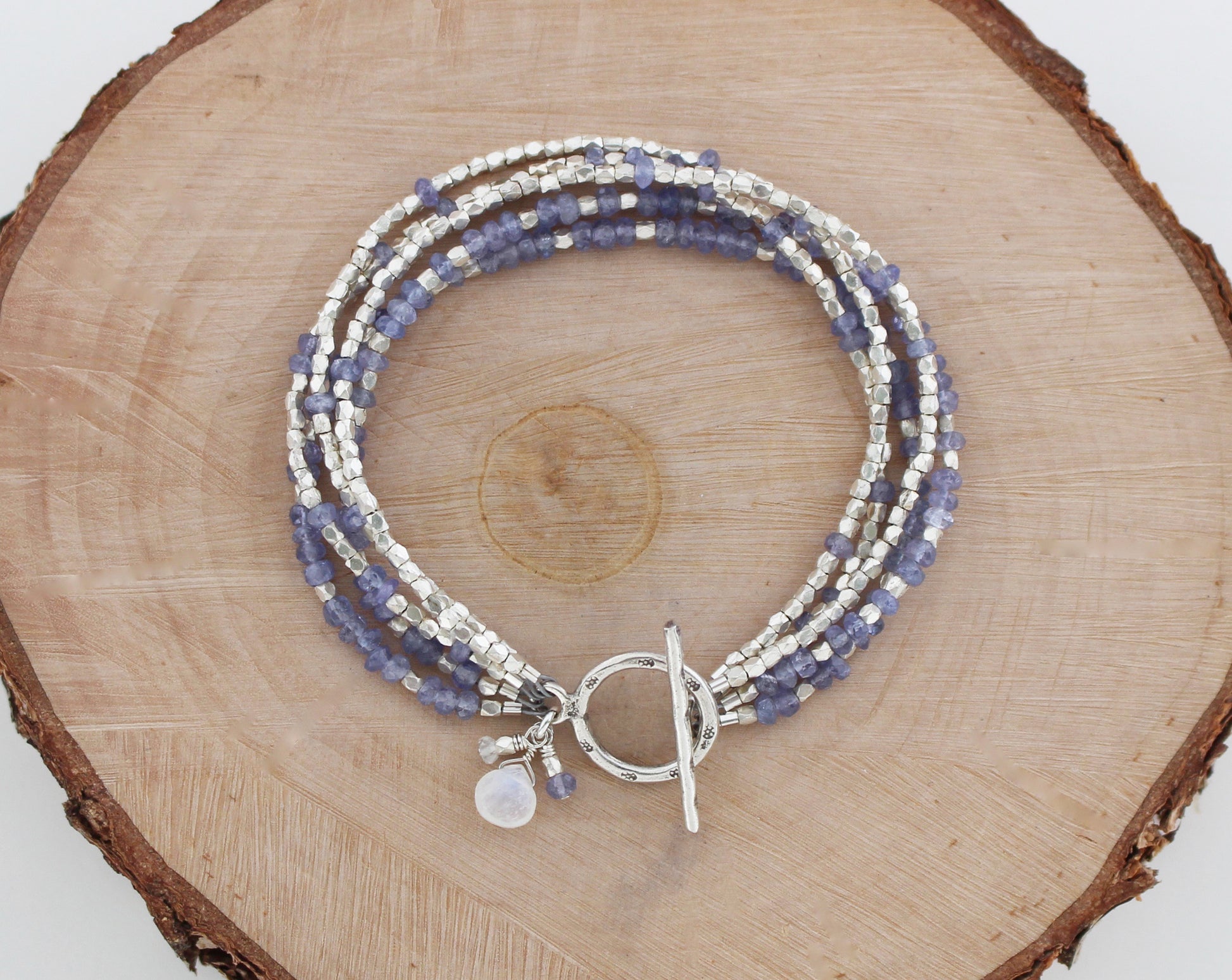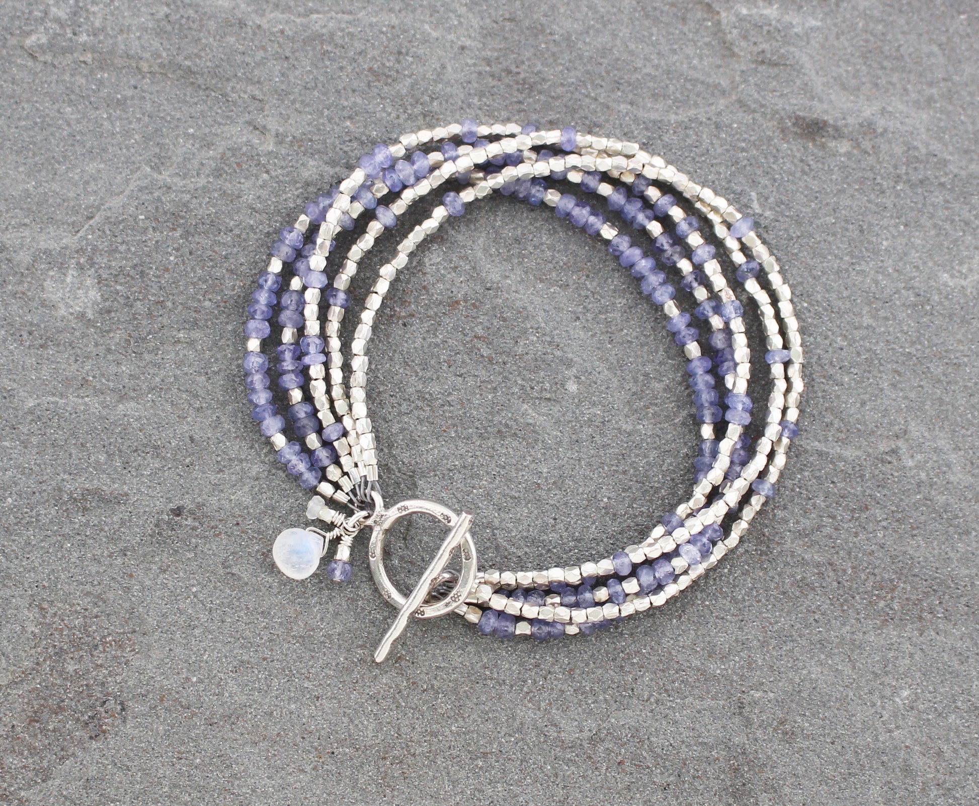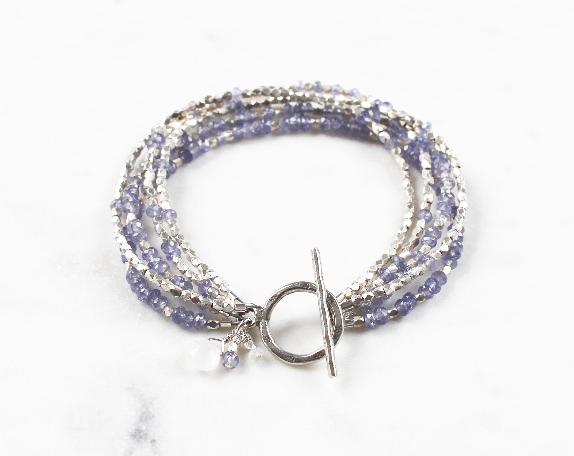 This bracelet features five beaded strands of faceted periwinkle blue Tanzanite and shiny faceted Thai fine silver cubes. Finished with a large Thai Hill Tribe fine silver toggle clasp and a coordinating cluster of tanzanite, moonstone and silver which hangs from the clasp. Soft hues and full of sparkle. Perfect for everyday wear, but would also dress up beautifully. A one of a kind exclusive design. Total length from each end of the toggle clasp measures 7 1/2".