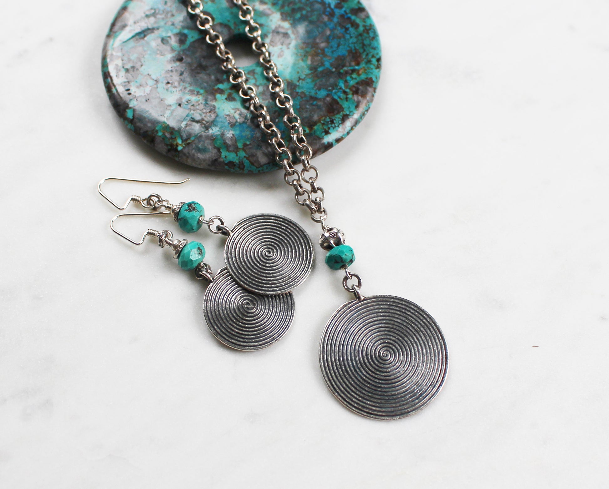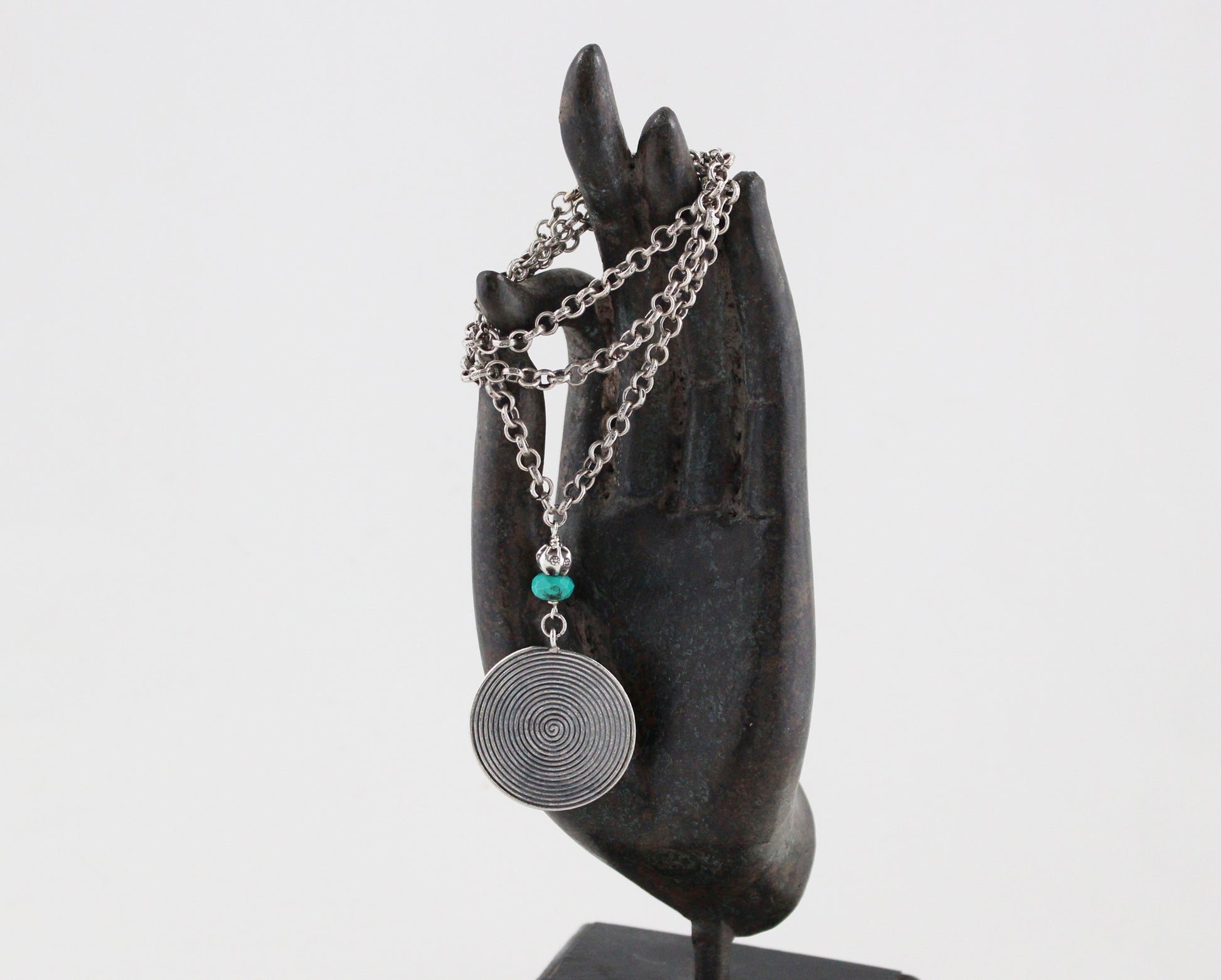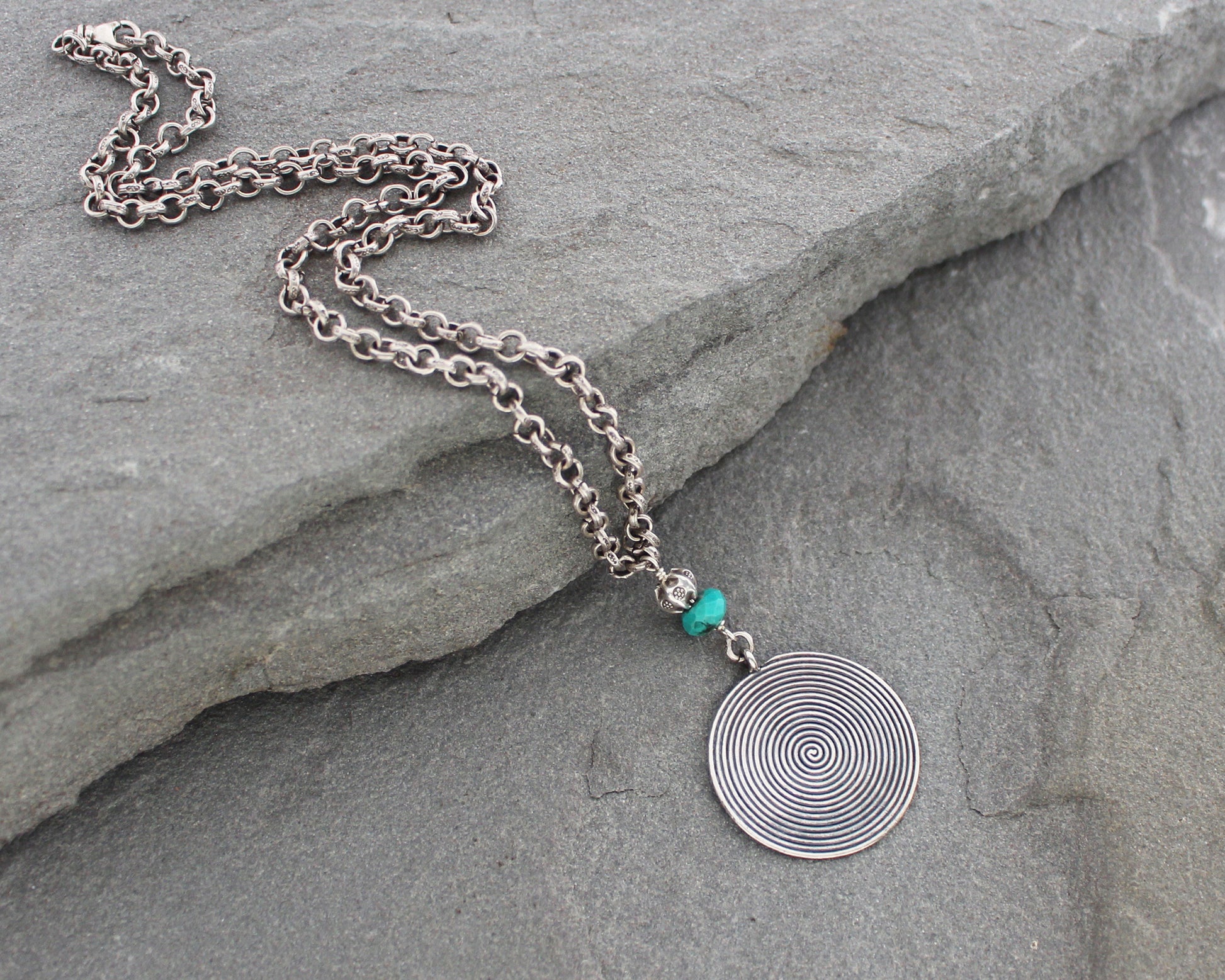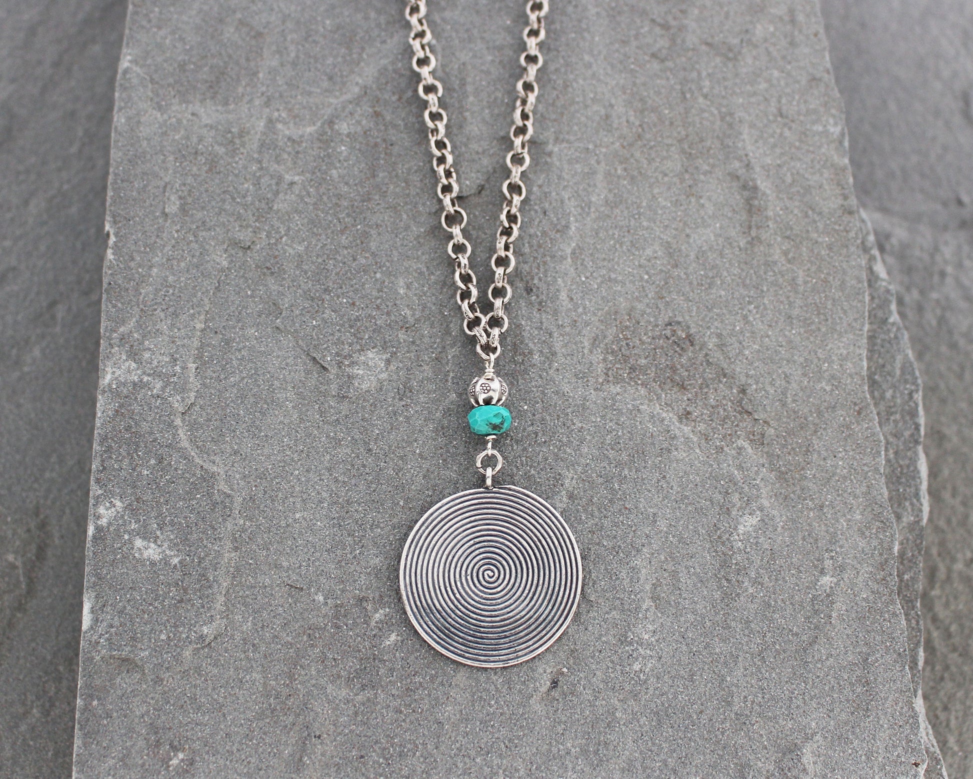 Thai Hill Tribe fine silver is paired with turquoise in this oxidized and rustic pendant necklace. Finished with a sterling lobster clasp. 18 inches in length with a 2 1/8 inch pendant drop.