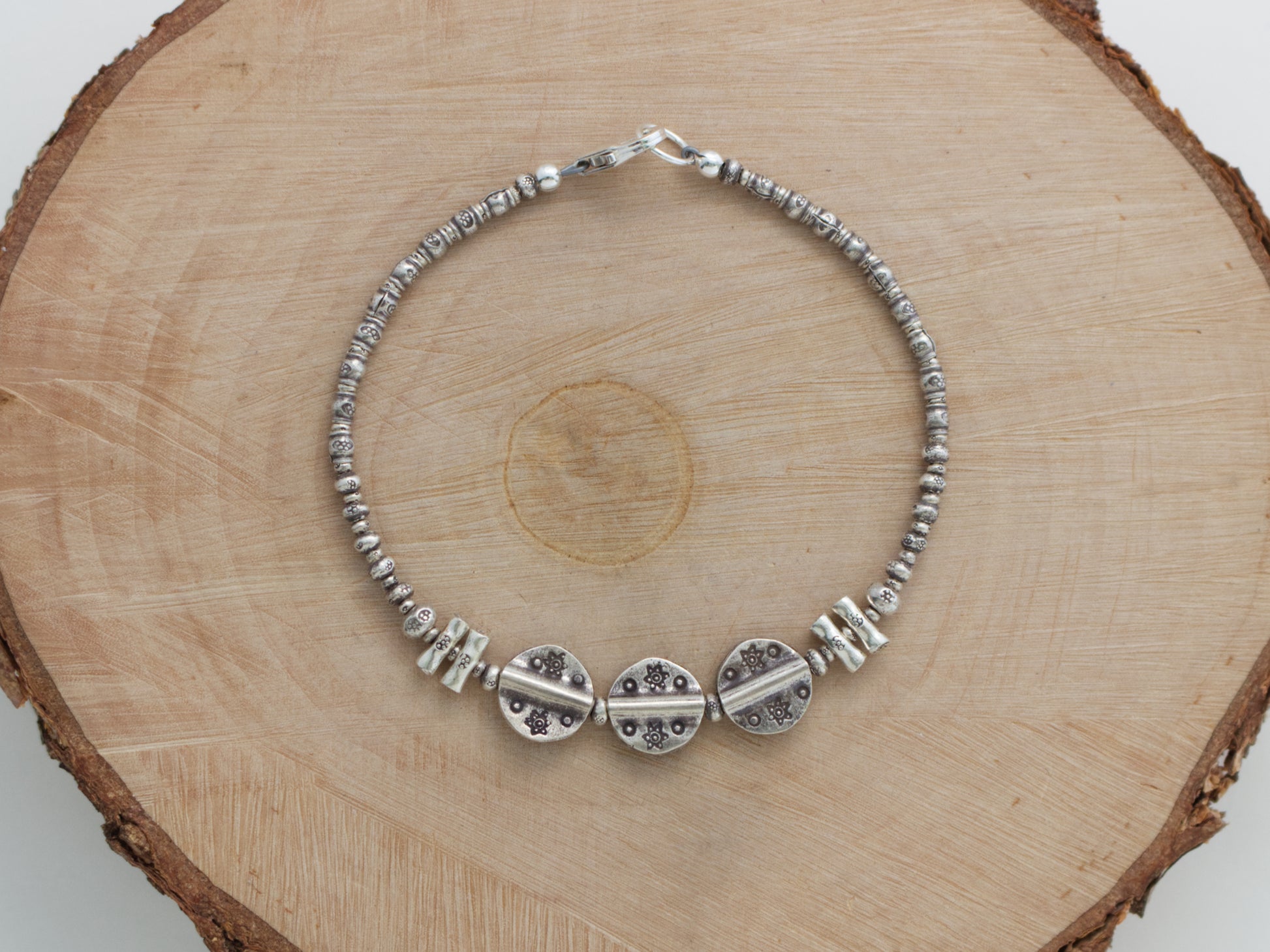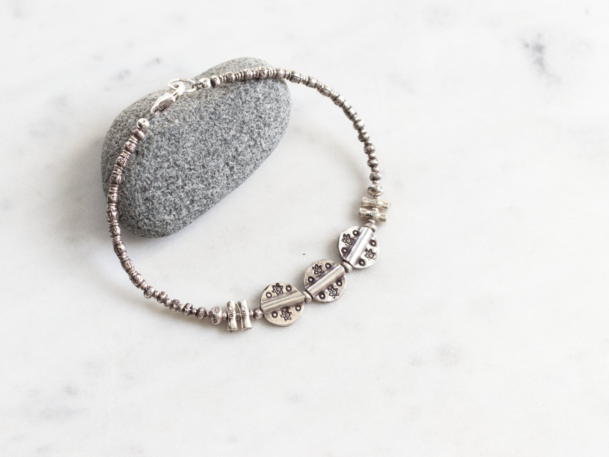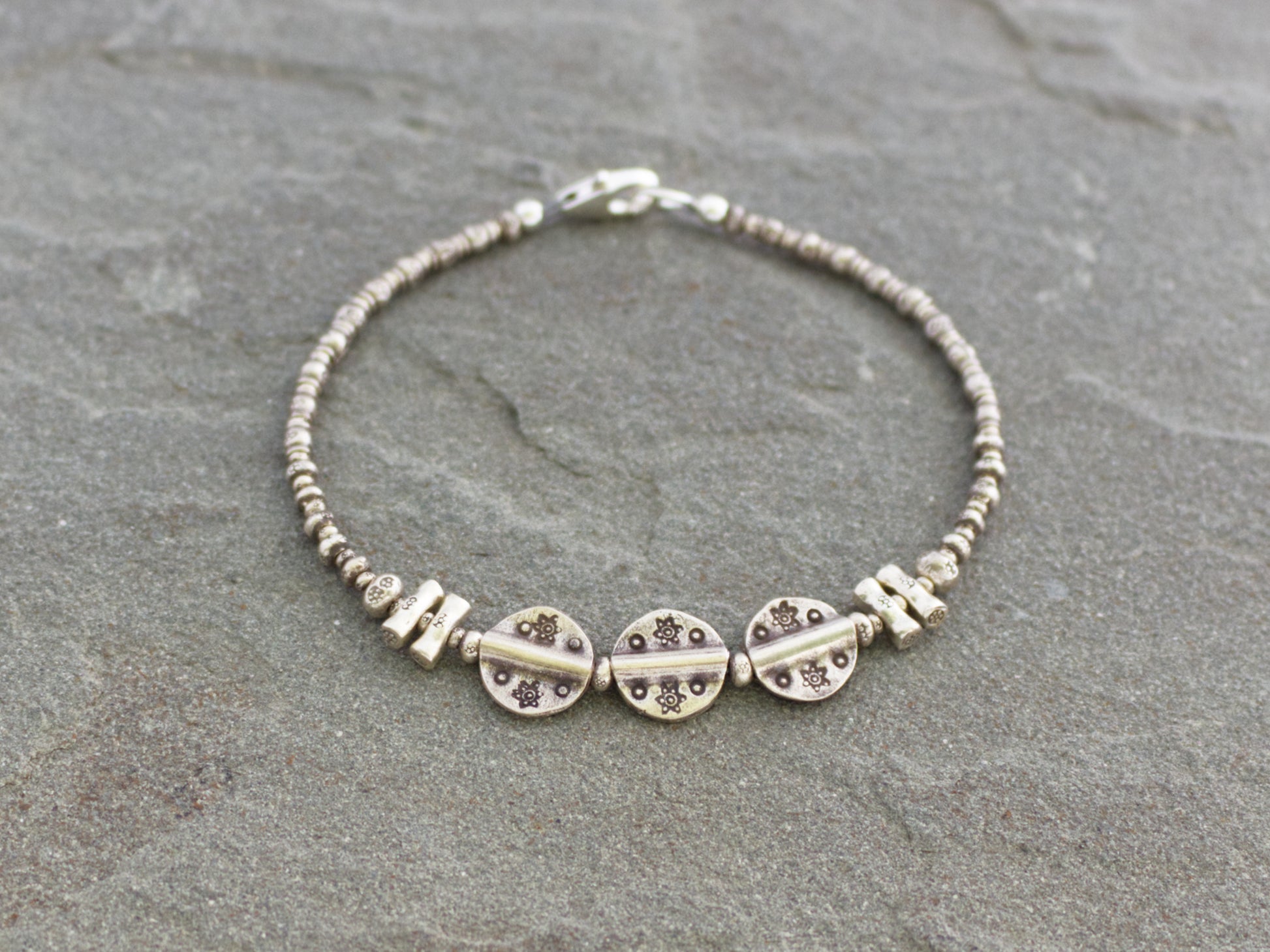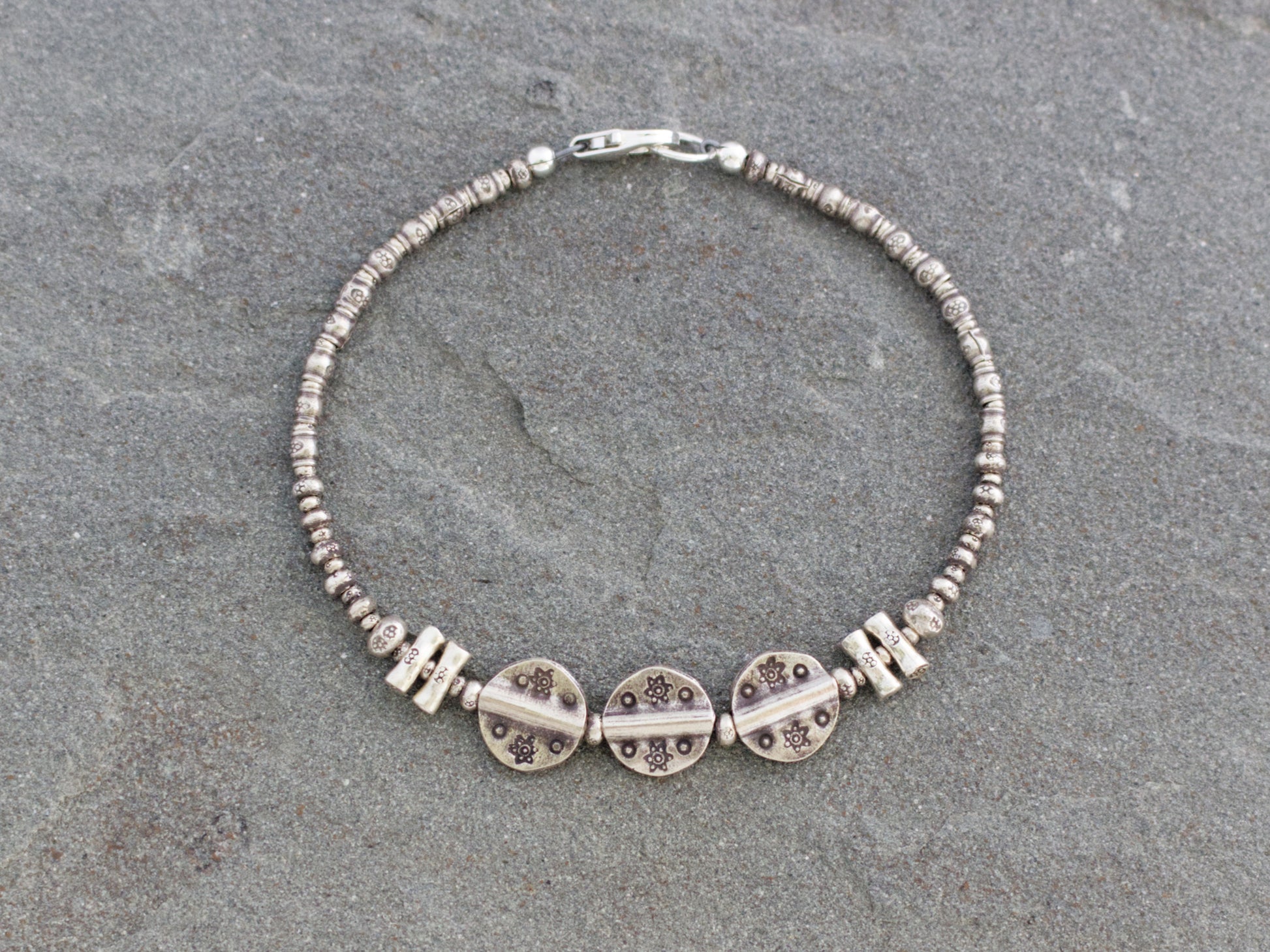 From sticks to discs, this bracelet features a unique array of stamped Thai Hill Tribe fine silver beads. It has a casual and rustic look, and would be perfect for everyday use. Wear it alone or layered with other bracelets for a stacked look. Finished with a secure sterling silver lobster clasp. Total length measures about 7.5 inches.