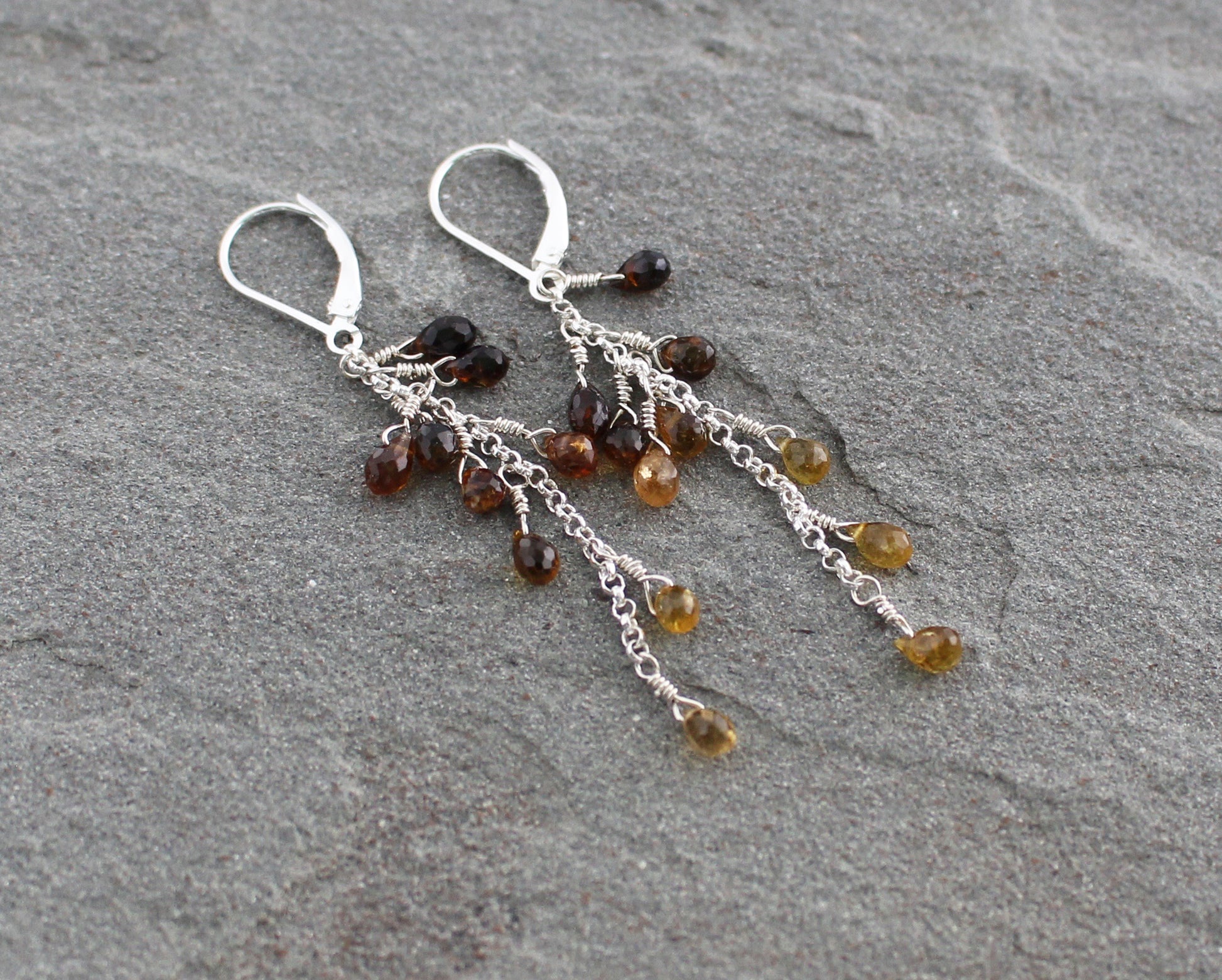 Sparkling and dainty tourmaline briolettes in an array of earth tones cascade down chains in sterling and hang from secure lever back ear wires. Length measures 2 1/2 inches from top to bottom.