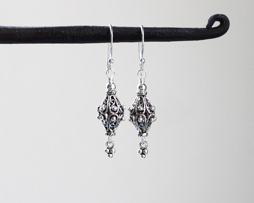Ornate sterling silver Turkish filigree beads are securely wire wrapped to dangle from sterling ear wires and finished with a sweet little coordinating Turkish charm on the bottom. Length measures 1 1/2 inches from the top of the ear wires.