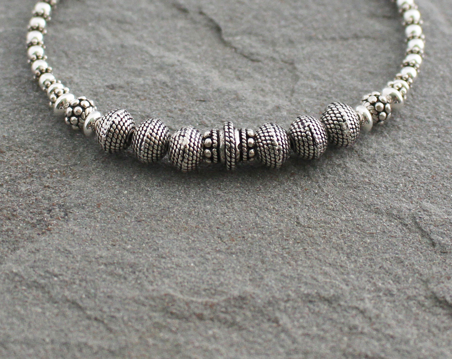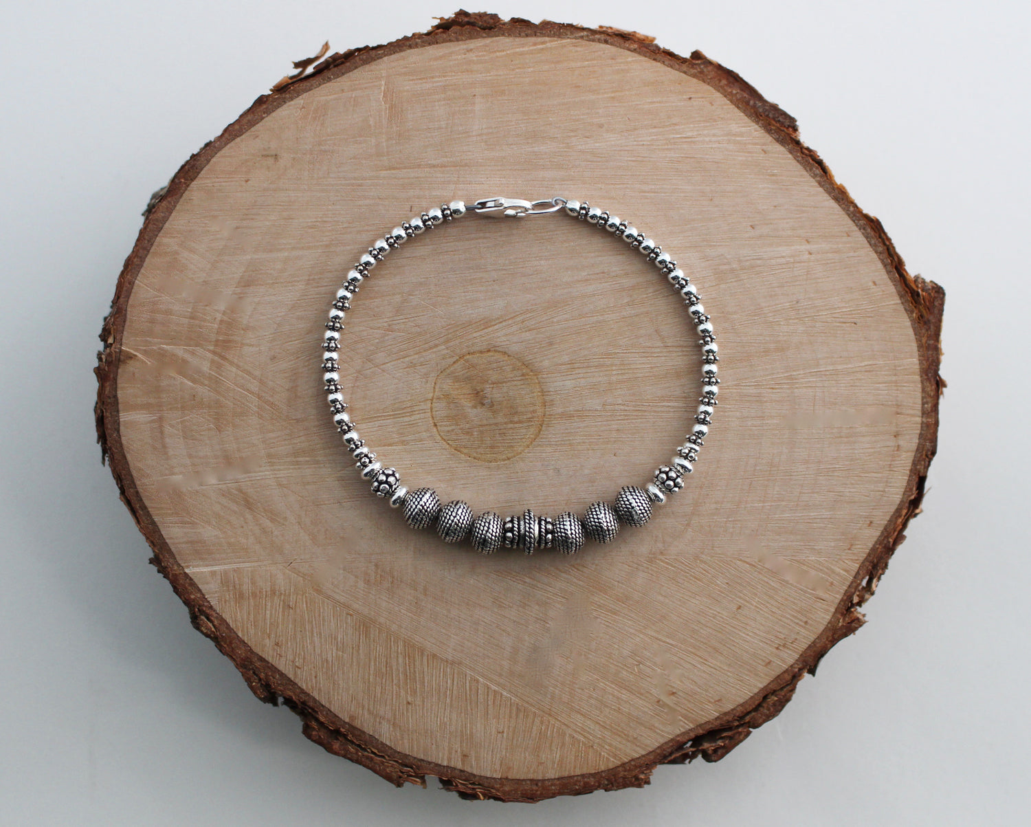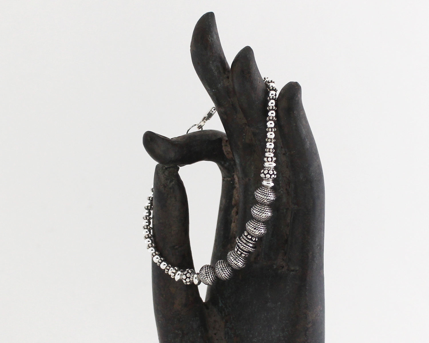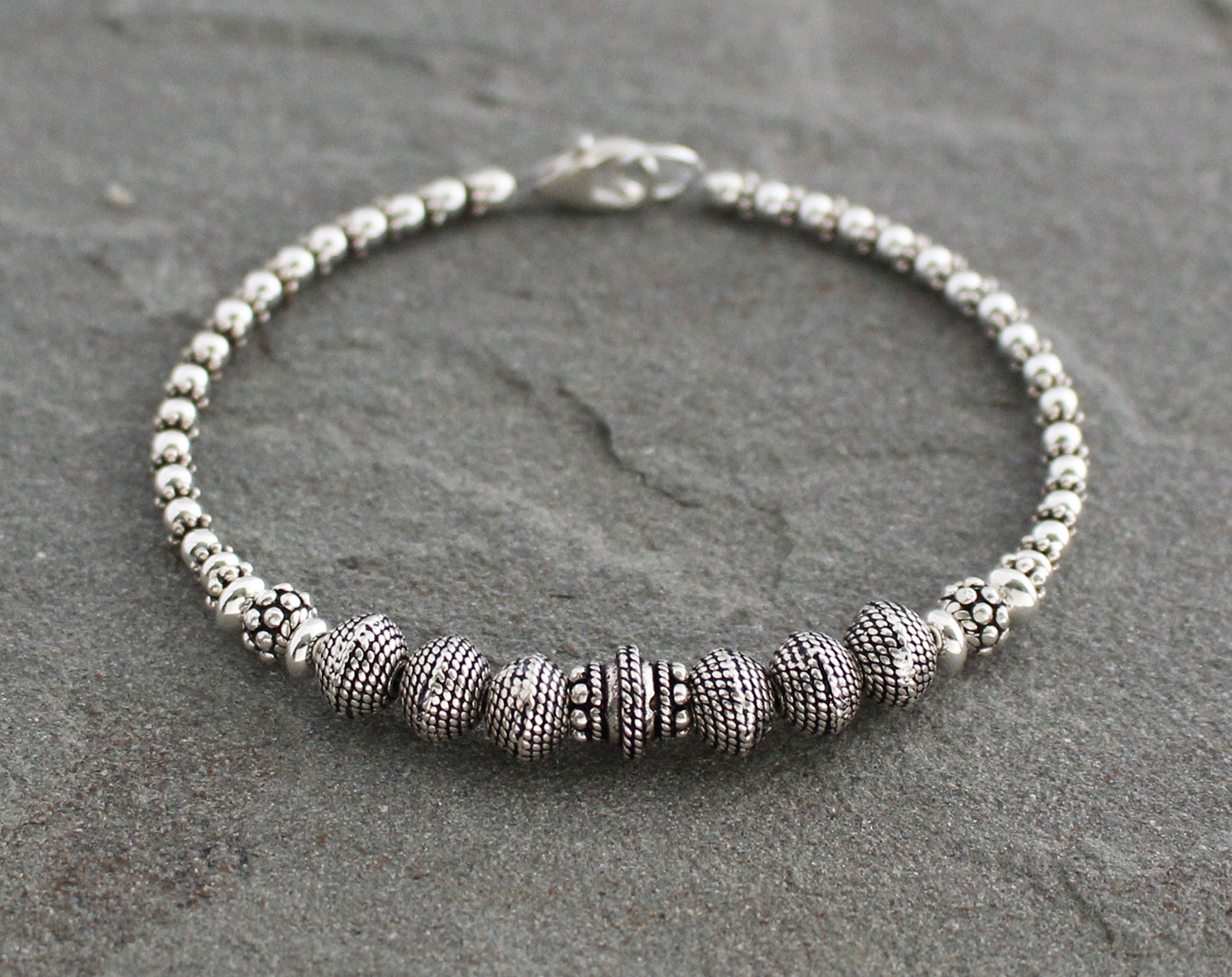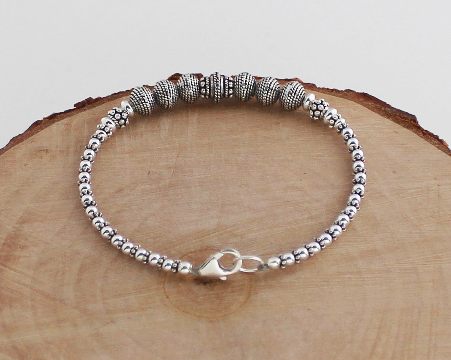 This classic Bali style bracelet features a selection of oxidized Turkish sterling silver focal beads hugged on either side by alternating silver balls and coordinating Turkish spacers. Securely finished with a sterling lobster clasp. Total length measures 7 1/2 inches.