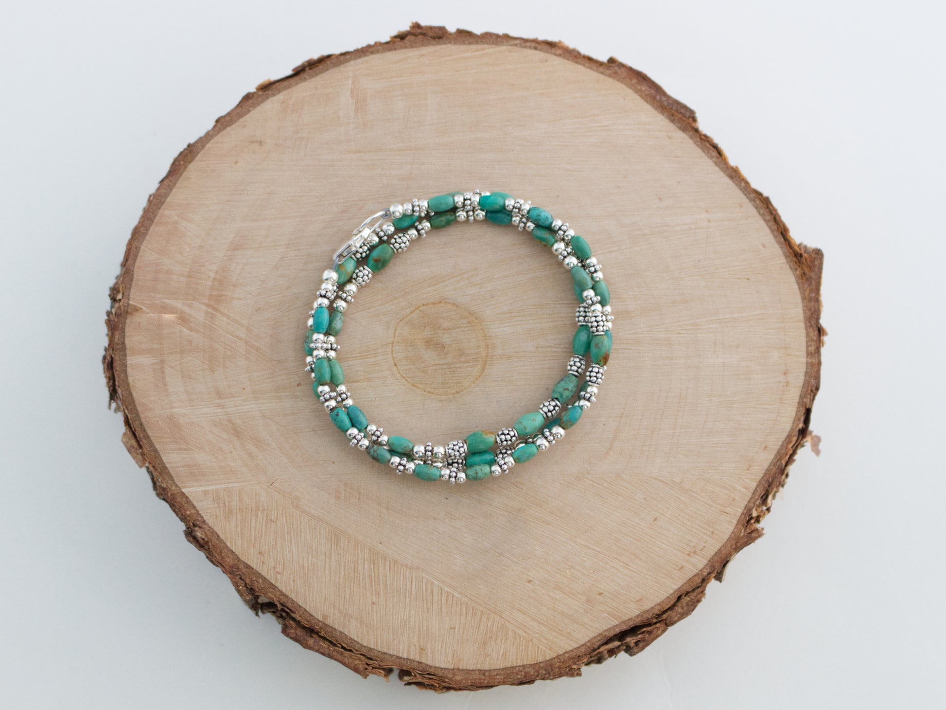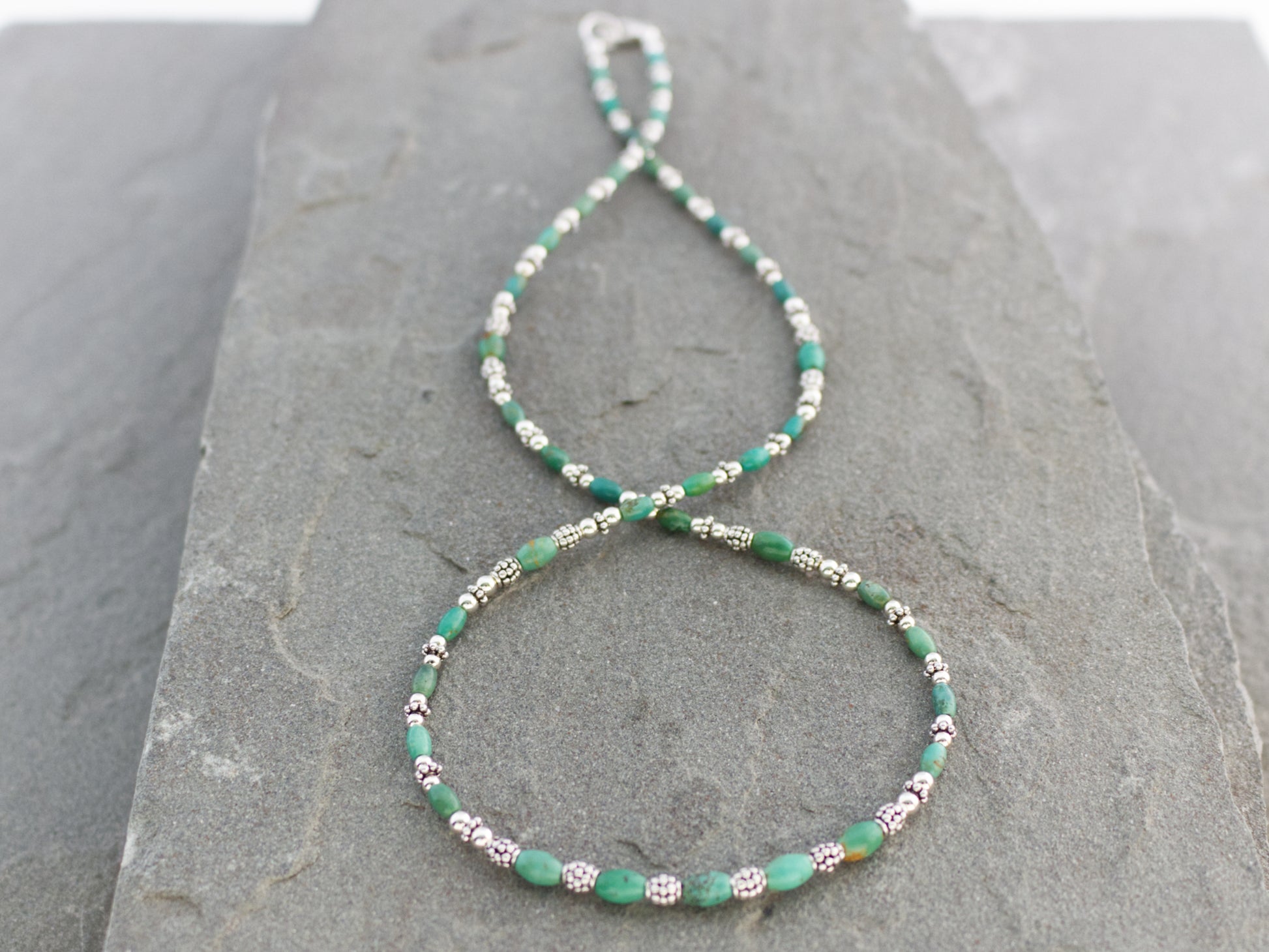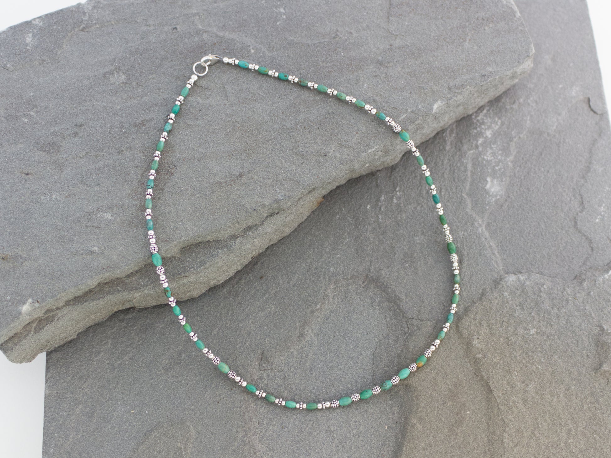 Teal green turquoise beads are accented with a selection of Turkish silver in this necklace. These stabilized turquoise stones are a beautiful soft seafoam green. Classic, comfortable and versatile. Finished with a sterling lobster clasp. Length measures 20 inches total.