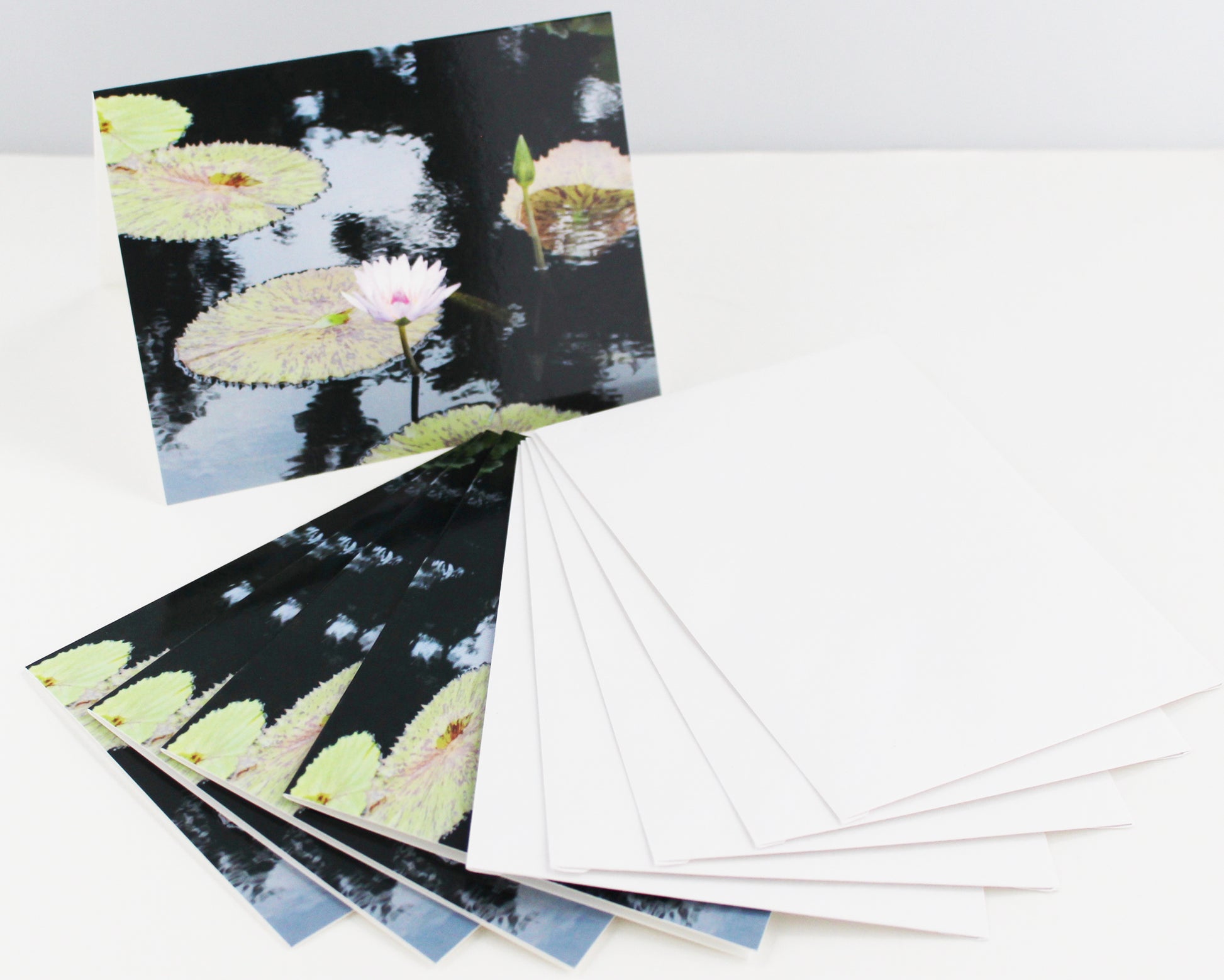 Set of 5 notecards. Glossy. Blank inside. Measures 5.5" x 4"